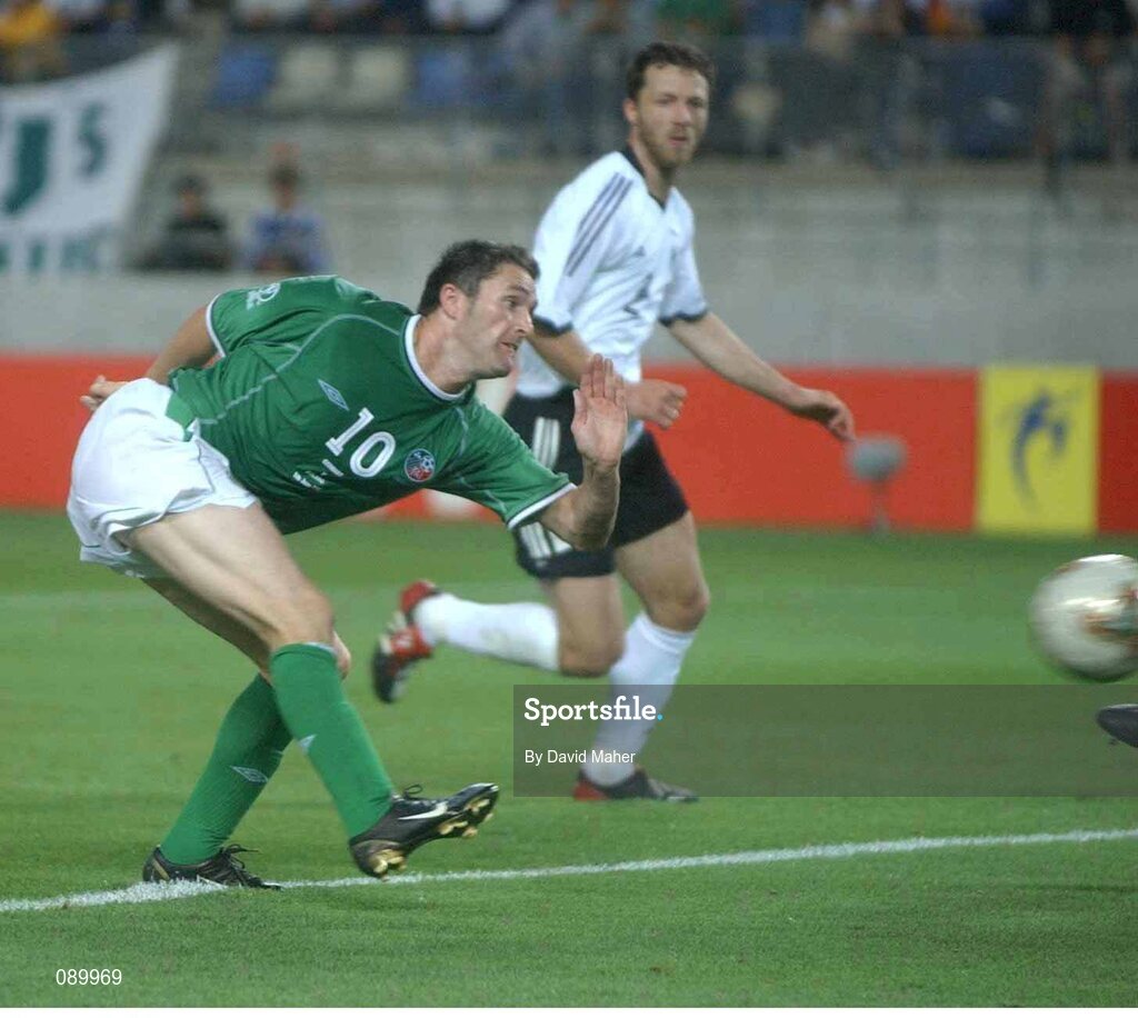 5 June 2002; Robbie Keane, Republic of Ireland, scores against Germany. FIFA World Cup Finals, Group E, Republic of Ireland v Germany, Ibaraki Stadium, Ibaraki, Japan. Picture credit: David Maher / SPORTSFILE