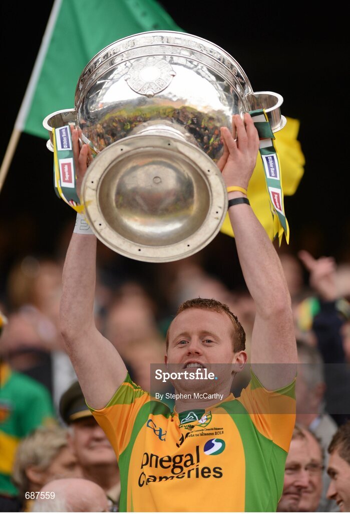 23 September 2012; Gary McFadden, Donegal, lifts the Sam Maguire Cup. GAA Football All-Ireland Senior Championship Final, Donegal v Mayo, Croke Park, Dublin. Picture credit: Stephen McCarthy / SPORTSFILE