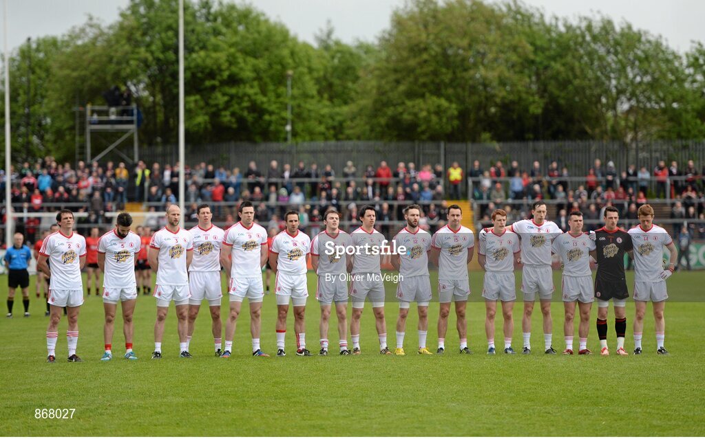 18 May 2014; The Tyrone team stand for the anthem. Ulster GAA Football Senior Championship Preliminary Round, Tyrone v Down, Healy Park, Omagh, Co. Tyrone. Picture credit: Oliver McVeigh / SPORTSFILE