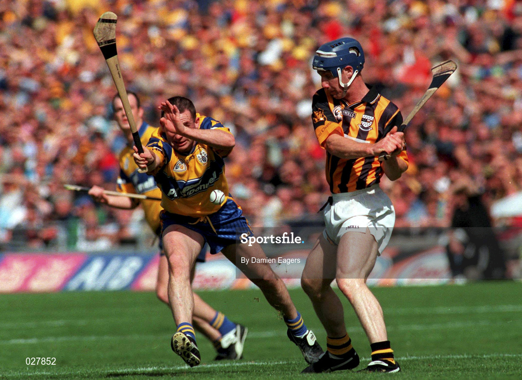 15 August 1999; Denis Byrne of Kilkenny in action against Colin Lynch of Clare during the Guinness All-Ireland Senior Hurling Championship Semi-Final match between Kilkenny and Clare at Croke Park in Dublin. Photo by Damien Eagers/Sportsfile