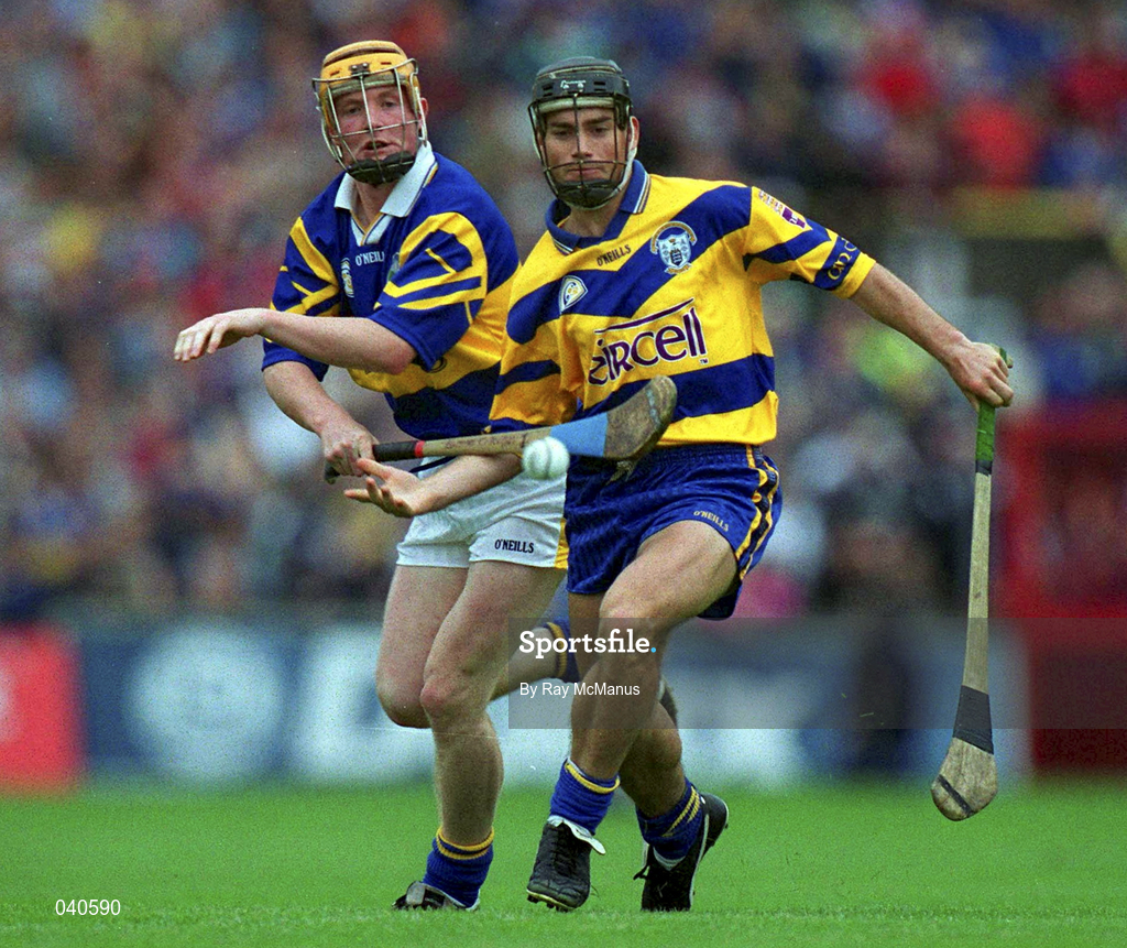 11 June 2000; Eamonn Corcoran of Tipperary in action against David Forde of Clare during the Guinness Munster Senior Hurling Championship Semi-Final match between Tipperary and Clare at Páirc Ui Chaoimh in Cork. Photo by Ray McManus/Sportsfile