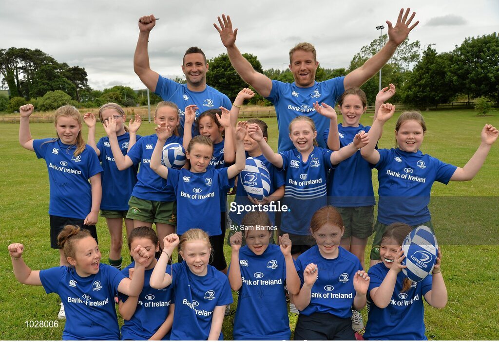 16 July 2015; Luke Fitzgerald and Dave Kearney of Leinster Rugby came out to the Bank of Ireland Summer Camp to meet up with some local young rugby talent in Greystones RFC. Pictured is Dave Kearney and Luke Fitzgerald with the female camp participants. Greystones RFC, Greystones, Co. Wicklow. Picture credit: Sam Barnes / SPORTSFILE