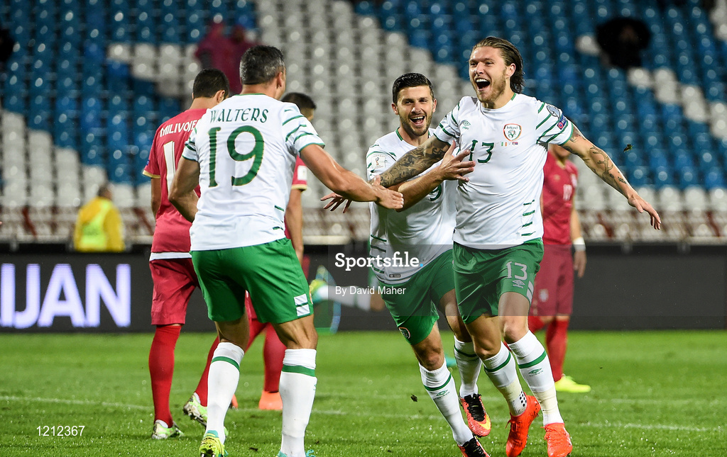 5 September 2016; Jeff Hendrick, right, of Ireland celebrates scoring his side's first goal with team mates Jonathan Walters, left, and Shane Long during the FIFA World Cup Qualifier match between Serbia and Republic of Ireland at the Red Star Stadium in Belgrade, Serbia. Photo by David Maher/Sportsfile