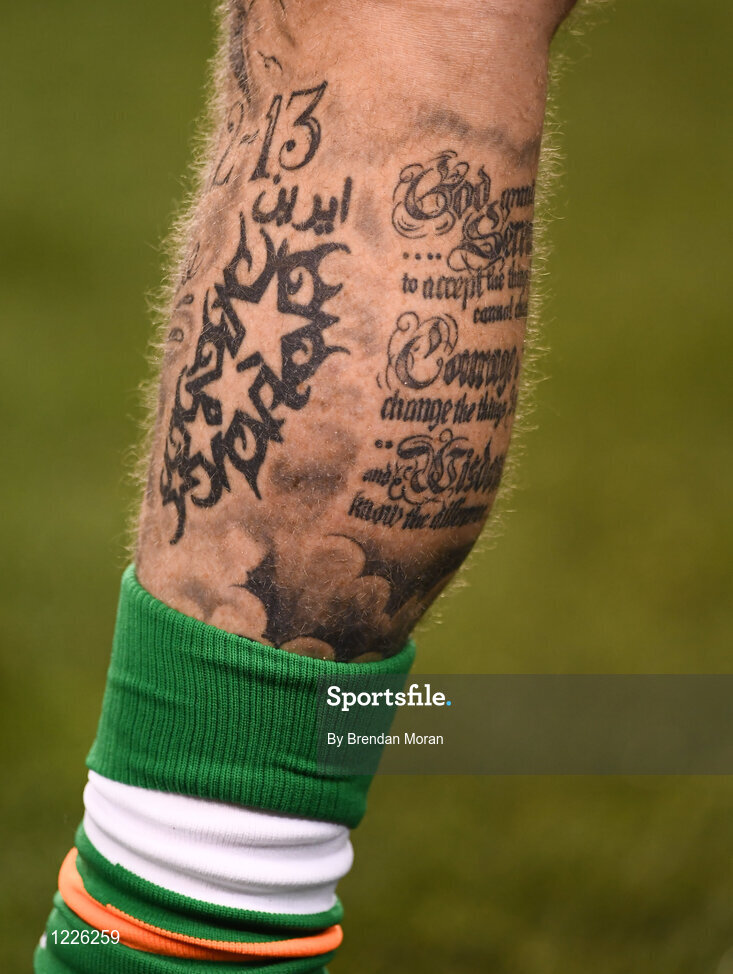 6 October 2016; A detailed view of tattoos on the leg of Republic of Ireland player, James McClean before the FIFA World Cup Group D Qualifier match between Republic of Ireland and Georgia at Aviva Stadium, Lansdowne Road in Dublin. Photo by Brendan Moran/Sportsfile