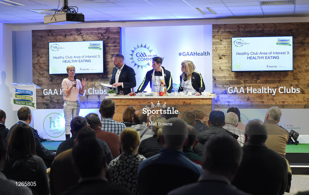4 February 2017; Connacht Healthy Club Roadshow - inspiring GAA clubs to become hubs for health. Pictured at the launch leading the call out for increased participation in the programme are Joane Rock from Irish Life with MC Eóin Conroy and Philly McMahon, Gaelic footballer for Dublin and Ballymun Kickhams. Exemplar Healthy Clubs such as Achill GAA, Mayo, Melvin Gaels GAA, Leitrim, Ballinderreen GAA Club and Anna Geary, former Cork camogie captain, Galway and Aghamore GAA, Mayo, encouraged and inspired other Connacht clubs to support their communities in pursuit of better physical and mental wellbeing. For more information, visit: www.gaa.ie/community Follow: @officialgaa or Like: www.facebook.com/officialgaa/. Ballyhaunis Centre of Excellence, Mayo. Photo by Matt Browne/Sportsfile