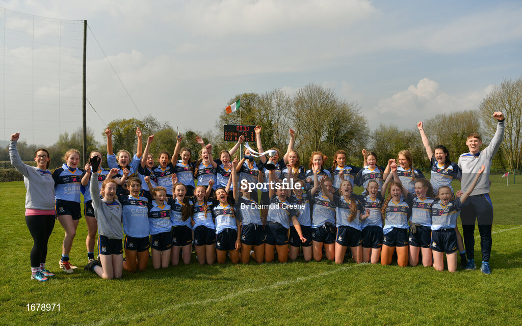 6 April 2019; The Cashel Community School squad, along with manager Richie Ryan and selector Nichola Gilmore, celebrate with the cup after the Lidl All Ireland Post Primary School Junior C Final match between Cashel Community School and FCJ Bunclody at St Molleran’s in Carrickbeg, Co. Waterford. Photo by Diarmuid Greene/Sportsfile