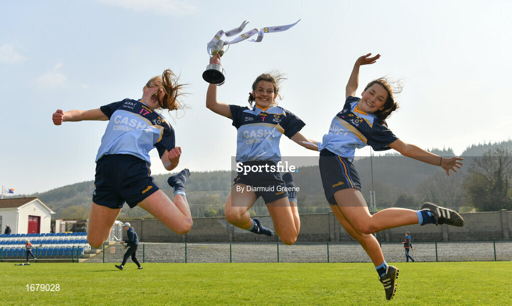 6 April 2019; Lucie Gilmartin, left, Grace Moloney, centre, and Ella O'Dwyer celebrate with the cup after the Lidl All Ireland Post Primary School Junior C Final match between Cashel Community School and FCJ Bunclody at St Molleran’s in Carrickbeg, Co. Waterford. Photo by Diarmuid Greene/Sportsfile
