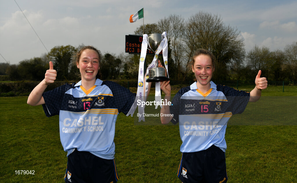 6 April 2019; Twins Annie, left, and Lily Fahie of Cashel Community School celebrate with the cup after the Lidl All Ireland Post Primary School Junior C Final match between Cashel Community School and FCJ Bunclody at St Molleran’s in Carrickbeg, Co. Waterford. Photo by Diarmuid Greene/Sportsfile