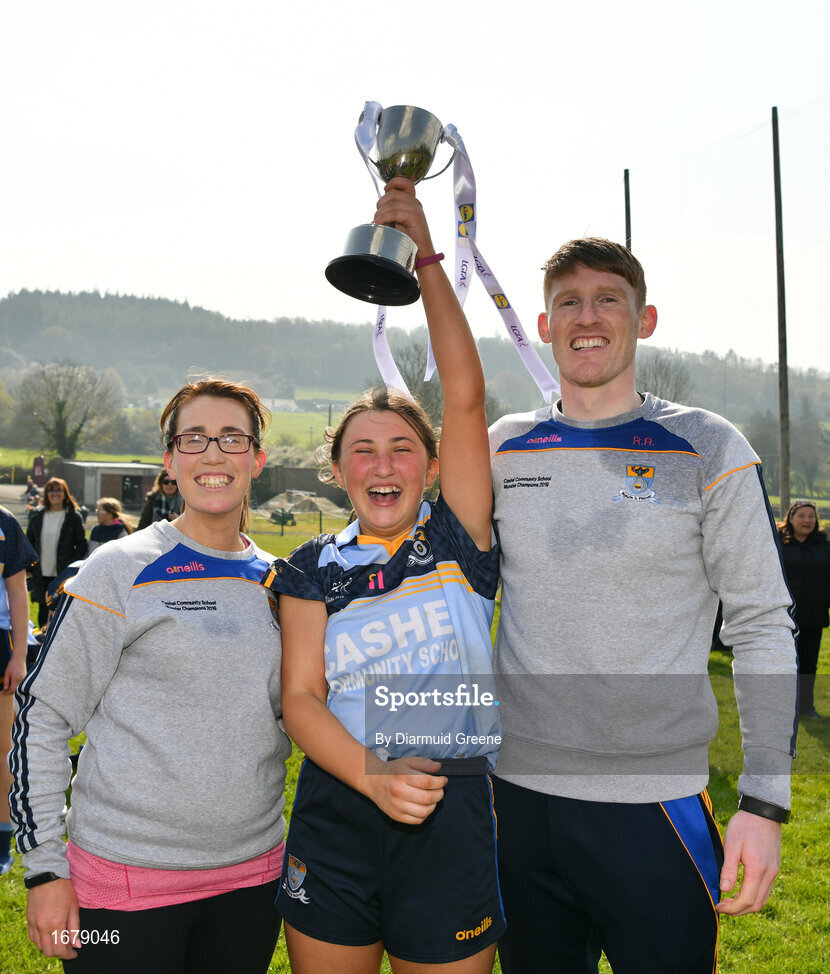 6 April 2019; Cashel Community School captain Leah Baskin lifts the cup along with selector Nichola Gilmore and manager Richie Ryan after the Lidl All Ireland Post Primary School Junior C Final match between Cashel Community School and FCJ Bunclody at St Molleran’s in Carrickbeg, Co. Waterford. Photo by Diarmuid Greene/Sportsfile