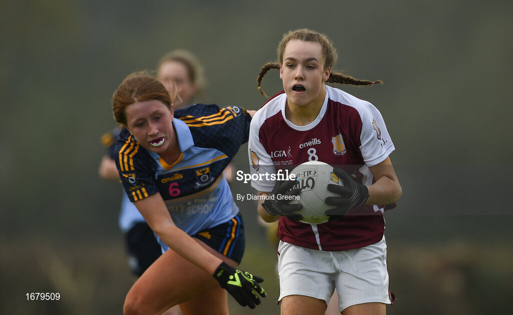 6 April 2019; Katie Breen-Sherlock of FCJ Bunclody in action against Katelyn Downey of Cashel Community School during the Lidl All Ireland Post Primary School Junior C Final match between Cashel Community School and FCJ Bunclody at St Molleran’s in Carrickbeg, Co. Waterford. Photo by Diarmuid Greene/Sportsfile