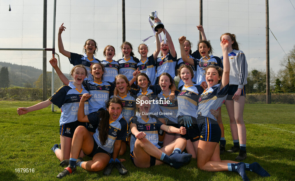 6 April 2019; Cashel Community School players celebrate with the cup after the Lidl All Ireland Post Primary School Junior C Final match between Cashel Community School and FCJ Bunclody at St Molleran’s in Carrickbeg, Co. Waterford. Photo by Diarmuid Greene/Sportsfile