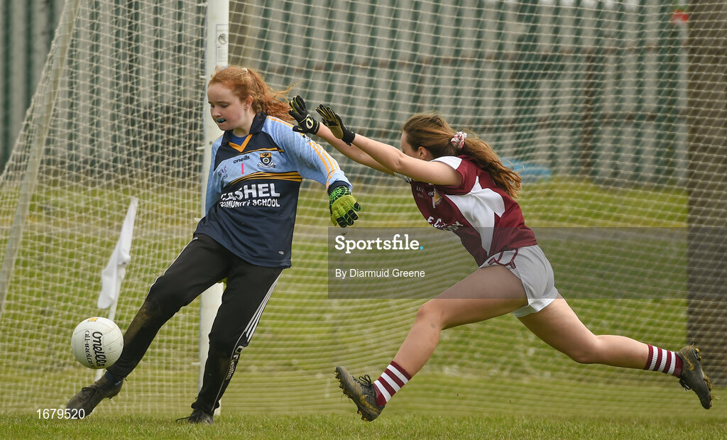 6 April 2019; Caoilinn Casey of Cashel Community School in action against of Katie Bates FCJ Bunclody during the Lidl All Ireland Post Primary School Junior C Final match between Cashel Community School and FCJ Bunclody at St Molleran’s in Carrickbeg, Co. Waterford. Photo by Diarmuid Greene/Sportsfile