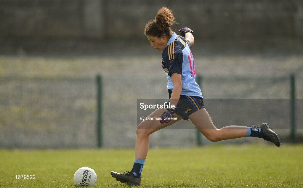 6 April 2019; Alessia Mazzola of Cashel Community School takes a penalty during the Lidl All Ireland Post Primary School Junior C Final match between Cashel Community School and FCJ Bunclody at St Molleran’s in Carrickbeg, Co. Waterford. Photo by Diarmuid Greene/Sportsfile