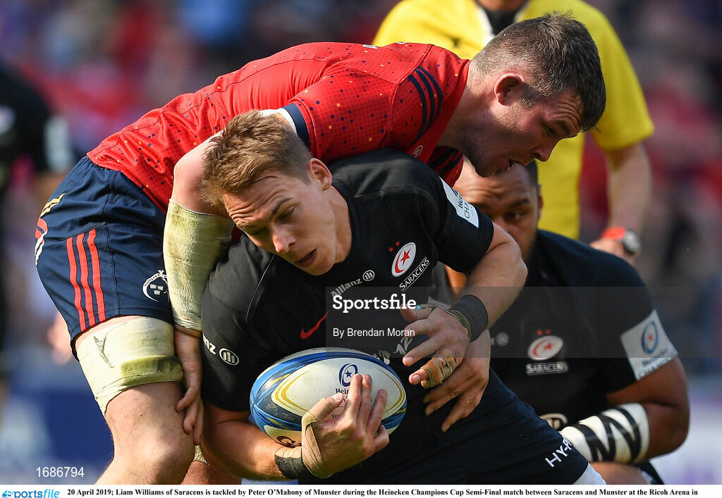 20 April 2019; Liam Williams of Saracens is tackled by Peter O’Mahony of Munster during the Heineken Champions Cup Semi-Final match between Saracens and Munster at the Ricoh Arena in Coventry, England. Photo by Brendan Moran/Sportsfile