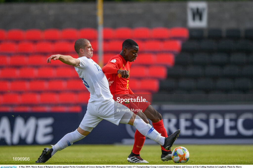 6 May 2019; Marco Kana of Belgium in action against Pavlos Grosdanis of Greece during the 2019 UEFA European Under-17 Championships Group A match between Belgium and Greece at City Calling Stadium in Longford. Photo by Harry Murphy/Sportsfile