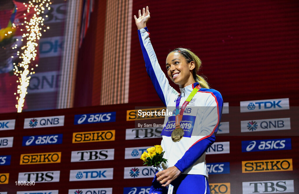 4 October 2019; Katarina Johnson-Thompson of Great Britian with her Gold Medal after competing in the Women's Heptathlon during day eight of the 17th IAAF World Athletics Championships Doha 2019 at the Khalifa International Stadium in Doha, Qatar. Photo by Sam Barnes/Sportsfile