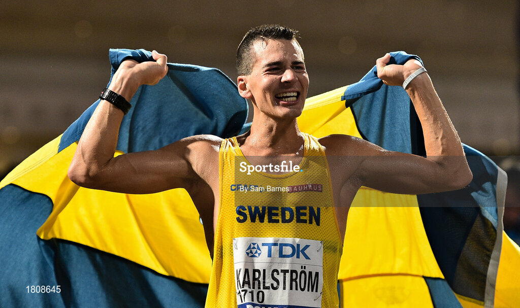 4 October 2019; Perseus Karlström of Sweden celebrates finishing third in the Men's 20km Race Walk during day eight of the 17th IAAF World Athletics Championships Doha 2019 at the Corniche in Doha, Qatar. Photo by Sam Barnes/Sportsfile