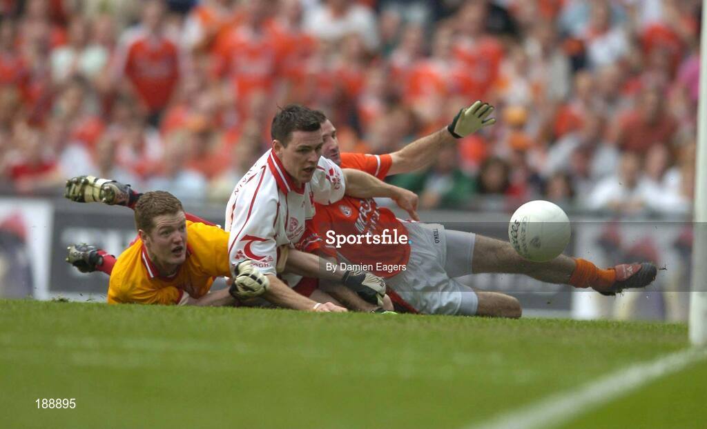 4 September 2005; Stephen McDonnell, Armagh, far right, scores a goal despite the efforts of Tyrone goalkeeper Pascal McConnell, left, and team-mate Conor Gormley. Bank of Ireland All-Ireland Senior Football Championship Semi-Final, Armagh v Tyrone, Croke Park, Dublin. Picture credit; Damien Eagers / SPORTSFILE