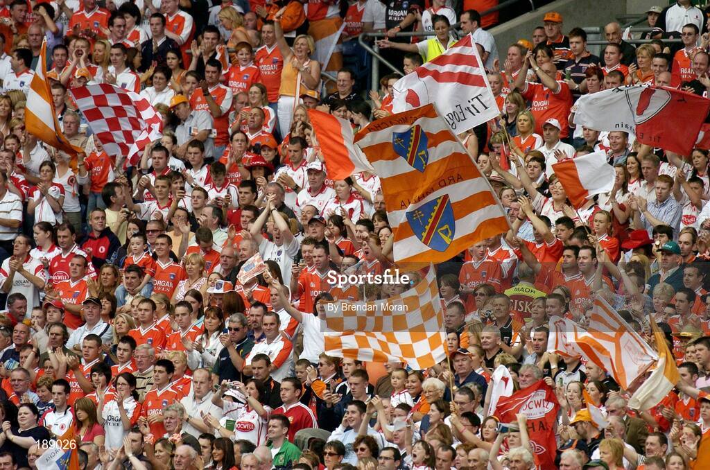 4 September 2005; Armagh and Tyrone fans cheer on their side. Bank of Ireland All-Ireland Senior Football Championship Semi-Final, Armagh v Tyrone, Croke Park, Dublin. Picture credit; Brendan Moran / SPORTSFILE