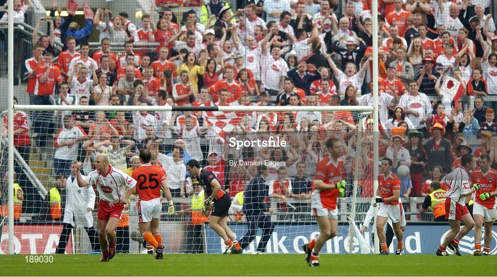 4 September 2005; Eoin Mulligan, Tyrone celebrates after his team-mate Peter Canavan kicks a match winning point, Bank of Ireland All-Ireland Senior Football Championship Semi-Final, Armagh v Tyrone, Croke Park, Dublin. Picture credit; Damien Eagers / SPORTSFILE