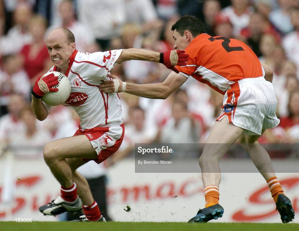 4 September 2005; Peter Canavan, Tyrone, in action against Andy Mallon, Armagh. Bank of Ireland All-Ireland Senior Football Championship Semi-Final, Armagh v Tyrone, Croke Park, Dublin. Picture credit; Brendan Moran / SPORTSFILE