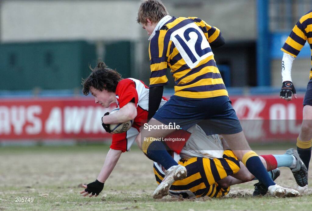 5 April 2006; Colm Gavin, Catholic University, is tackled by Joe Curran and Sam McGlynn, King's Hospital School. Fr. Godfrey Cup Final, Donnybrook, Dublin. Picture credit: David Levingstone / SPORTSFILE