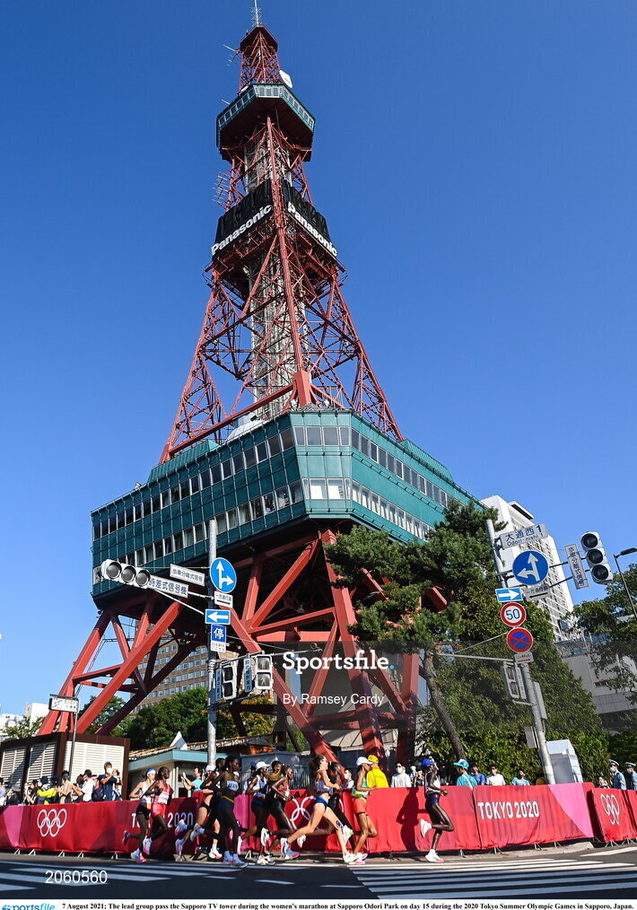7 August 2021; The lead group pass the Sapporo TV tower during the women's marathon at Sapporo Odori Park on day 15 during the 2020 Tokyo Summer Olympic Games in Sapporo, Japan. Photo by Ramsey Cardy/Sportsfile