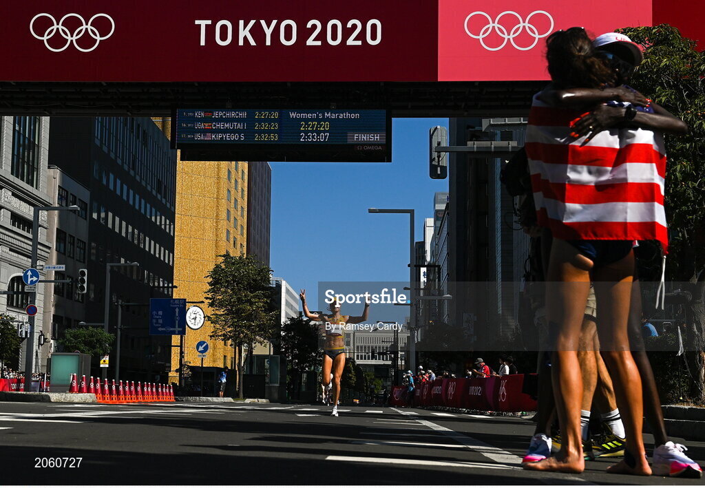 7 August 2021; Deboarah Schoneborn of Germany celebrates finishing 18th in the women's marathon at Sapporo Odori Park on day 15 during the 2020 Tokyo Summer Olympic Games in Sapporo, Japan. Photo by Ramsey Cardy/Sportsfile