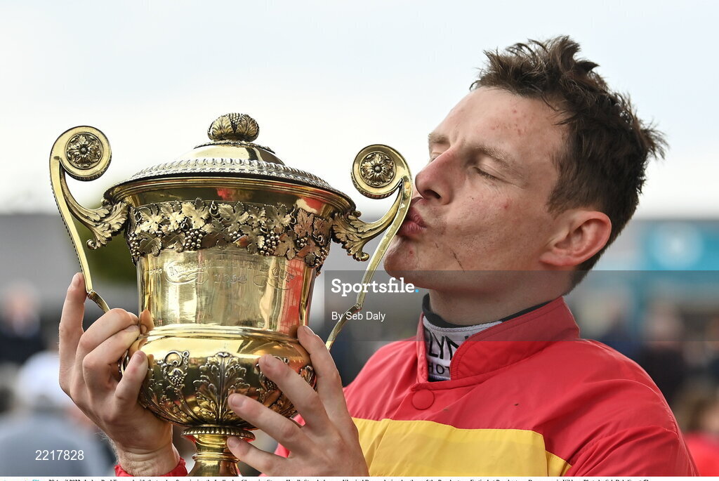 28 April 2022; Jockey Paul Townend with the trophy after winning the Ladbrokes Champion Stayers Hurdle Steeplechase on Klassical Dream during day three of the Punchestown Festival at Punchestown Racecourse in Kildare. Photo by Seb Daly/Sportsfile