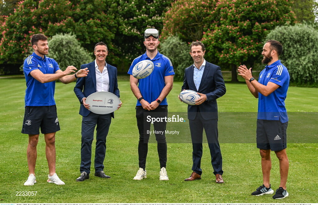 18 May 2022; BearingPoint, the official innovation partner of Leinster Rugby, has today hosted a milestone event showcasing the capabilities of metaverse technology for the Leinster Rugby sporting community, pictured are Leinster Rugby players Hugo Keenan, Will Connors and Jamison Gibson-Park with Leinster Rugby sponsorship manager Eamon De Búrca and BearingPoint regional leader Eric Conway at the UCD University Club in Dublin. Photo by Harry Murphy/Sportsfile