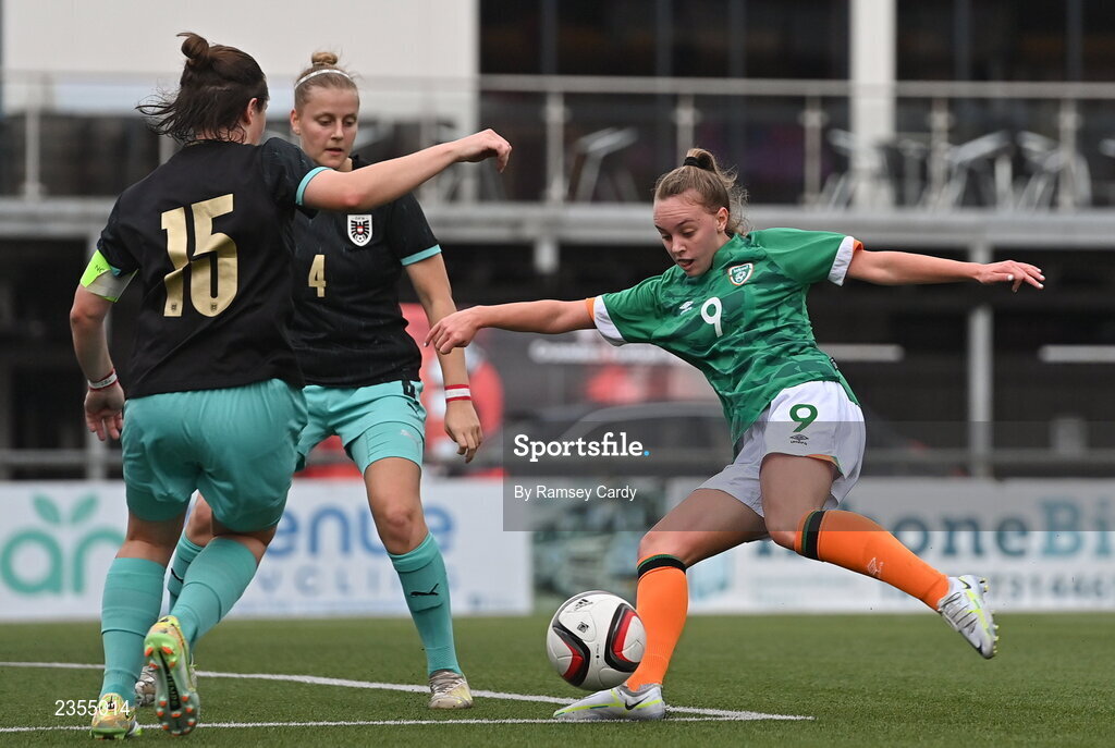 21 October 2022; Joy Ralph of Republic of Ireland shoots at goal during the 2022/23 UEFA Women's U17 European Championship Qualifiers Round 1 match between Republic of Ireland and Austria at Seaview in Belfast. Photo by Ramsey Cardy/Sportsfile