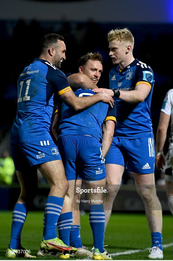 18 February 2023; Luke McGrath of Leinster celebrates with teammates, from left, Dave Kearney, Liam Turner and Jamie Osborne after scoring his side's second try during the United Rugby Championship match between Leinster and Dragons at RDS Arena in Dublin. Photo by Harry Murphy/Sportsfile