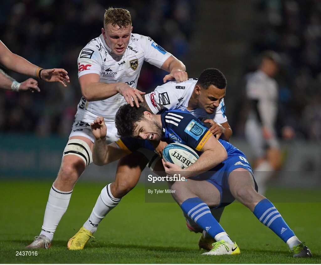 18 February 2023; Harry Byrne of Leinster is tackled by Ashton Hewitt, centre, and Ben Fry of Dragons during the United Rugby Championship match between Leinster and Dragons at RDS Arena in Dublin. Photo by Tyler Miller/Sportsfile