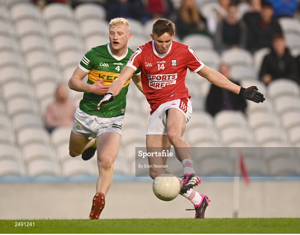 24 April 2023; Hugh O’Connor of Cork in action against Joey Nagle of Kerry during the EirGrid GAA Football U20 Munster Championship Final match between Cork and Kerry at Páirc Uí Chaoimh in Cork. Photo by Eóin Noonan/Sportsfile
