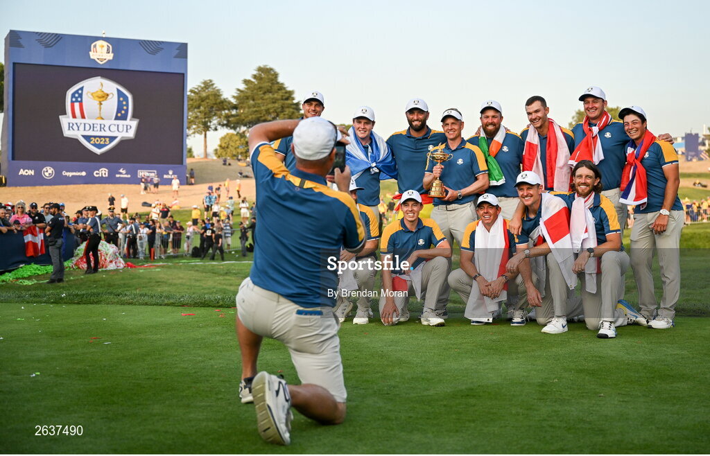 1 October 2023; A caddie takes a photo of the Europe team with the Ryder Cup after the singles matches on the final day of the 2023 Ryder Cup at Marco Simone Golf and Country Club in Rome, Italy. Photo by Brendan Moran/Sportsfile