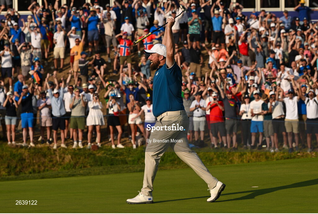 1 October 2023; Shane Lowry of Europe celebrates after going one up on the 17th green during the singles matches on the final day of the 2023 Ryder Cup at Marco Simone Golf and Country Club in Rome, Italy. Photo by Brendan Moran/Sportsfile
