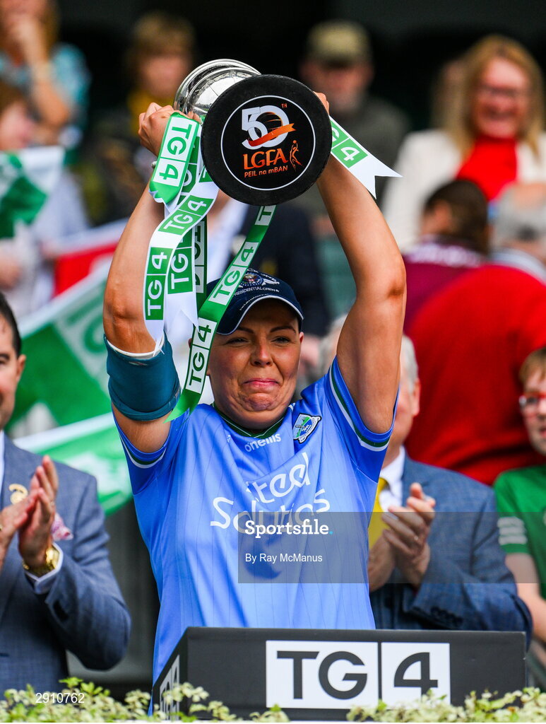 4 August 2024; Roisin Gleeson of Fermanagh lifts the cup after her side's victory in the TG4 All-Ireland Ladies Junior Football Championship final match between Fermanagh and Louth at Croke Park, Dublin. Photo by Ray McManus/Sportsfile
