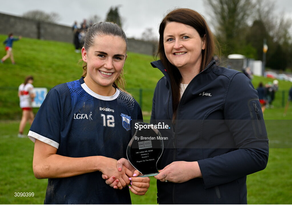 29 March 2025; Kellyann Hogan of Waterford is presented with the Player of the Match Award by Lidl Ireland sales operations manager Julie Irwin following her performance in the Lidl Ladies National Football League Division 1 match between Waterford and Mayo at Kilmacthomas GAA Club in Waterford. Photo by Brendan Moran/Sportsfile