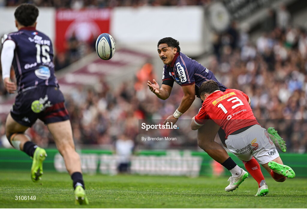 12 April 2025; Yoram Moefana of Bordeaux Begles offloads in a tackle by Tom Farrell of Munster during the Investec Champions Cup quarter-final match between Bordeaux Begles and Munster at Stade Chaban-Delmas in Bordeaux, France. Photo by Brendan Moran/Sportsfile