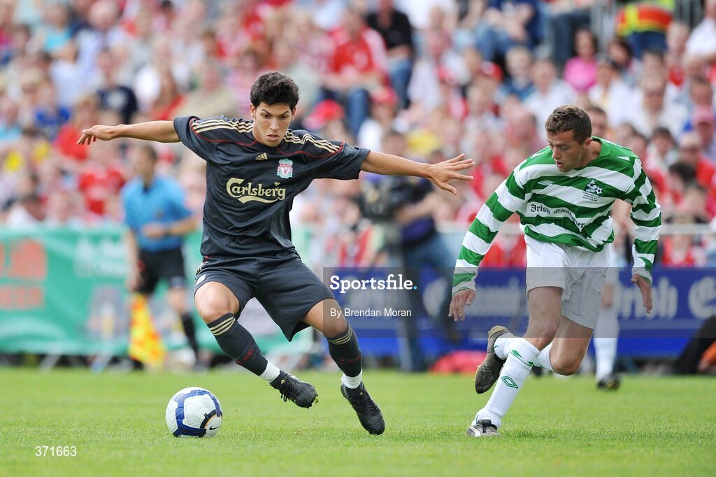 6 August 2009; Daniel Pacheco, Liverpool FC XI, in action against Barry O'Neill, Dunmanway Town AFC. Pre-Season Friendly, Dunmanway Town AFC v Liverpool FC XI, Maria Immaculata Community College, Dunmanway, Co. Cork. Picture credit: Brendan Moran / SPORTSFILE