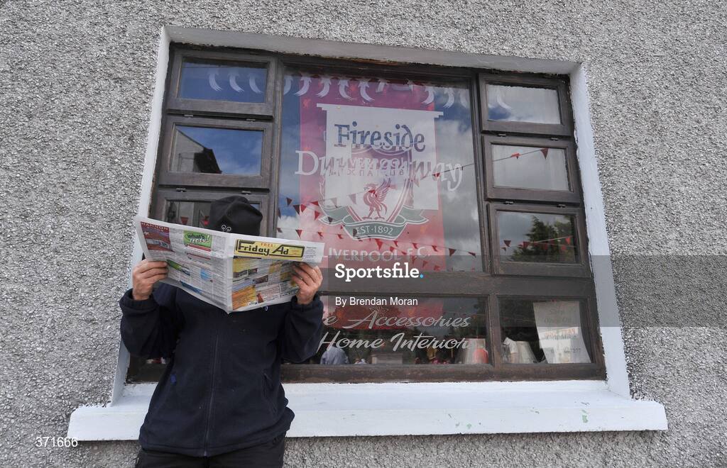 6 August 2009; A local is engrossed in his newspaper outside a building decorated for the game. Pre-Season Friendly, Dunmanway Town AFC v Liverpool FC XI, Maria Immaculata Community College, Dunmanway, Co. Cork. Picture credit: Brendan Moran / SPORTSFILE