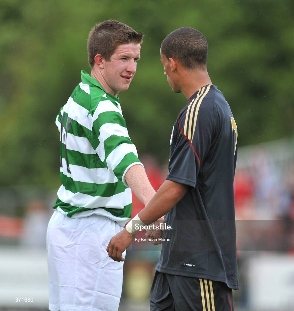 6 August 2009; Declan O'Dwyer, left, Dunmanway Town AFC, shakes hands with Nathan Eccleston, Liverpool, after the final whistle. Pre-Season Friendly, Dunmanway Town AFC v Liverpool FC XI, Maria Immaculata Community College, Dunmanway, Co. Cork. Picture credit: Brendan Moran / SPORTSFILE
