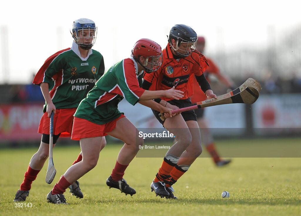 13 December 2009; Paula McCloy, Lavey, in action against Siobhan Kavanagh and Mary Claire Dunphy, left, St. Anne's Dunhill. All-Ireland Junior Camogie Club Championship Final Replay, Lavey, Derry, v St. Anne's Dunhill, Waterford, Donaghmore, Ashbourne, Co. Meath. Picture credit: Brian Lawless / SPORTSFILE