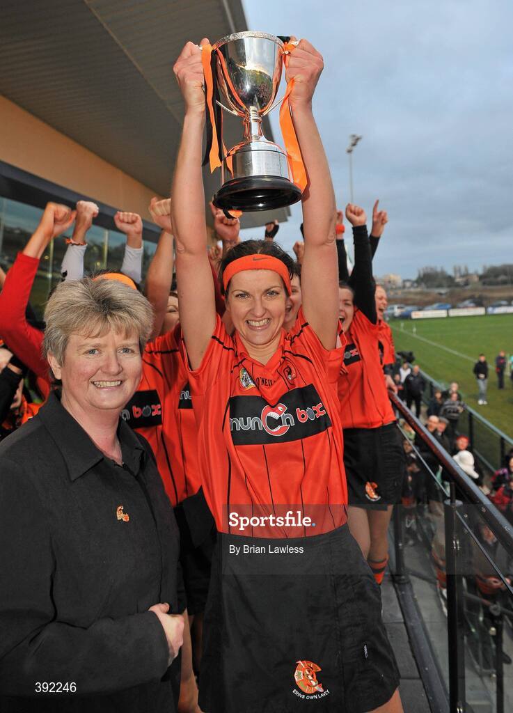 13 December 2009; Lavey captain Siobhan Convery lifts the cup in the company of Joan O'Flynn, President of the Camogie Association. All-Ireland Junior Camogie Club Championship Final Replay, Lavey, Derry, v St. Anne's Dunhill, Waterford, Donaghmore, Ashbourne, Co. Meath. Picture credit: Brian Lawless / SPORTSFILE *** Local Caption ***
