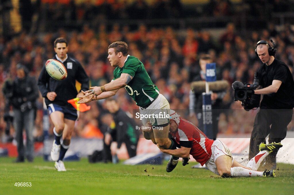 12 March 2011; Gordon D'Arcy, Ireland, is tackled by Leigh Halfpenny, Wales. RBS Six Nations Rugby Championship, Wales v Ireland, Millennium Stadium, Cardiff, Wales. Picture credit: Barry Cregg / SPORTSFILE