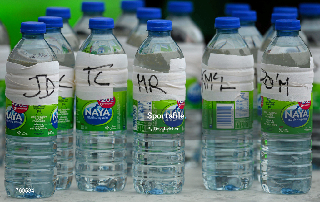 13 June 2013; The Ireland squad's water bottles marked with the initials of, from left, James Downey, Tom Court, Mike Ross, Kevin McLaughlin and Peter O'Mahony during squad training, ahead of their game against Canada. Ireland Rugby Summer Tour 2013. Toronto, Canada. Photo by David Maher/Sportsfile
