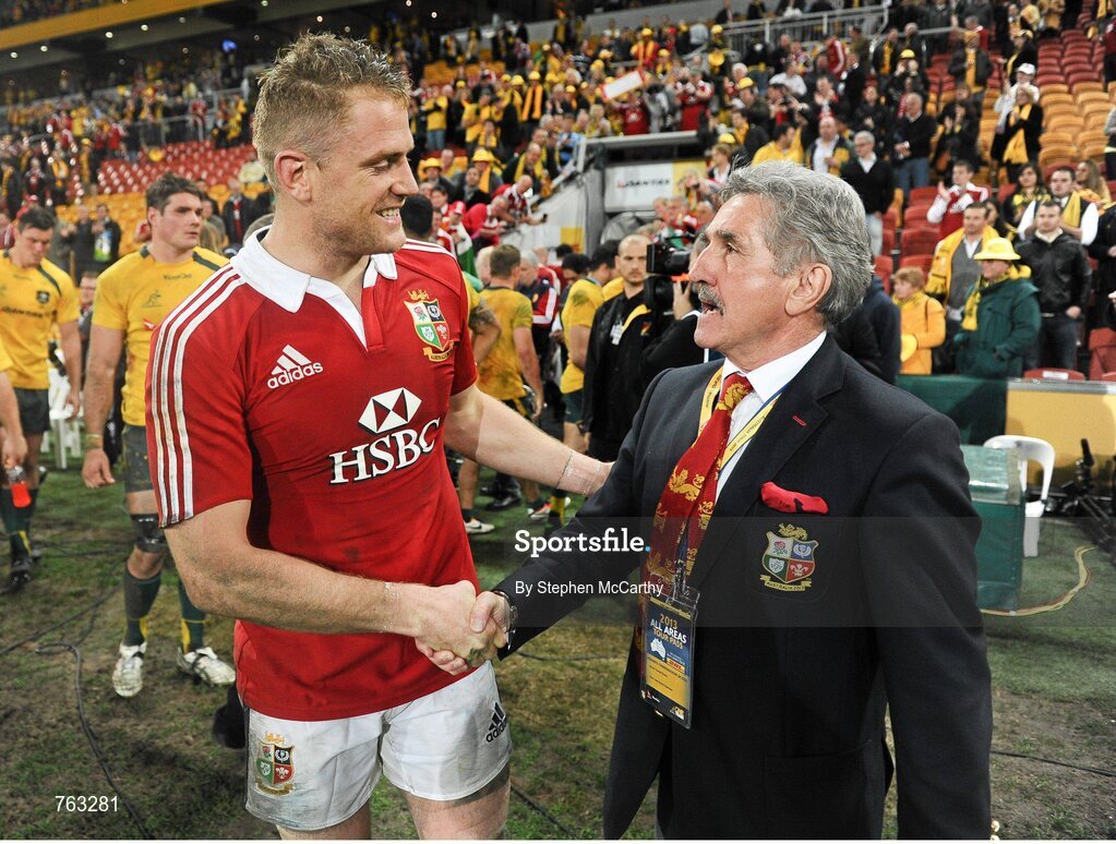 22 June 2013; Jamie Heaslip is congratulated by British & Irish Lions Board Chairman Gerald Davis following victory. British & Irish Lions Tour 2013, 1st Test, Australia v British & Irish Lions, Suncorp Stadium, Brisbane, Queensland, Australia. Picture credit: Stephen McCarthy / SPORTSFILE