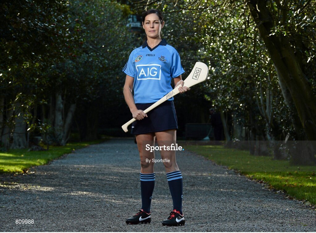 12 November 2013; Pictured wearing the new Dublin jersey featuring the logo of Dublin GAA sponsor, AIG Insurance, is Dublin camogie player Louise O'Hara. The full kit is now in production and will be available for purchase in retail outlets nationwide from the 15th of November. The new partnership between Dublin GAA and AIG Ireland sees AIG exclusively sponsoring the county’s hurling, football, ladies football and camogie teams at all levels. This is the first time in Dublin GAA history that all codes have been united under one sponsor. Dublin GAA and AIG Sponsorship and New Jersey Launch, Iveagh Gardens, Dublin. Photo by Sportsfile