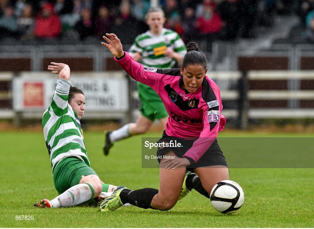 18 May 2014; Rianna Jarrett, Wexford Youths Women's AFC, is fouled by Kim Flood, Castlebar Celtic, resulting in a penalty being awarded and referee Rhona Daly sending off the Castlebar Celtic player. Bus Éireann Women’s National League Cup Final, Wexford Youths Women's AFC v Castlebar Celtic, Ferrycarrig Park, Wexford. Picture credit: David Maher / SPORTSFILE