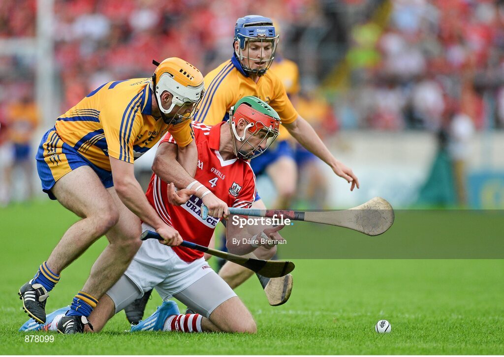 15 June 2014; Stephen McDonnell, Cork, in action against Conor McGrath, left, and Paraic Collins, Clare. Munster GAA Hurling Senior Championship, Semi-Final, Clare v Cork, Semple Stadium, Thurles, Co. Tipperary. Picture credit: Dáire Brennan / SPORTSFILE